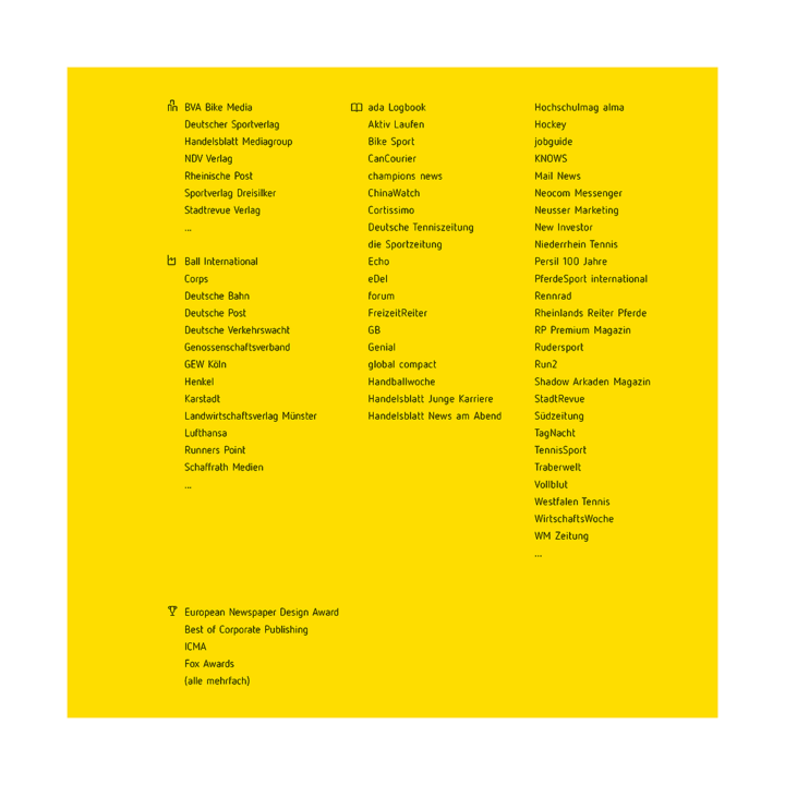 Die Leistung von Andi Goral reicht von der kompletten Neukonzeption eines Magazins, dessen Typografie und Bildsprache bis hin zu Relaunches oder der Umsetzung einzelner Layouts, denen Sie besondere Aufmerksamkeit schenken möchten.